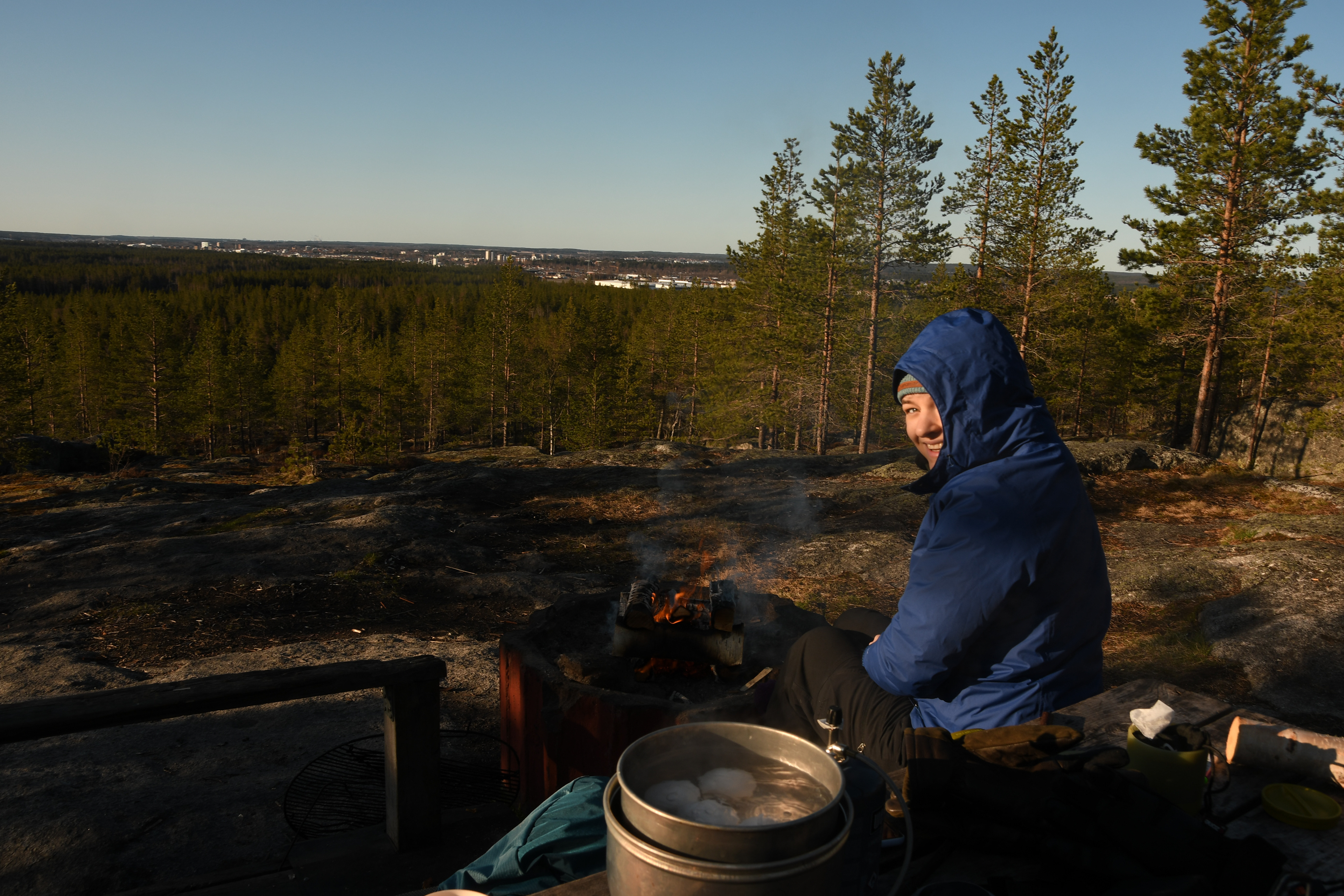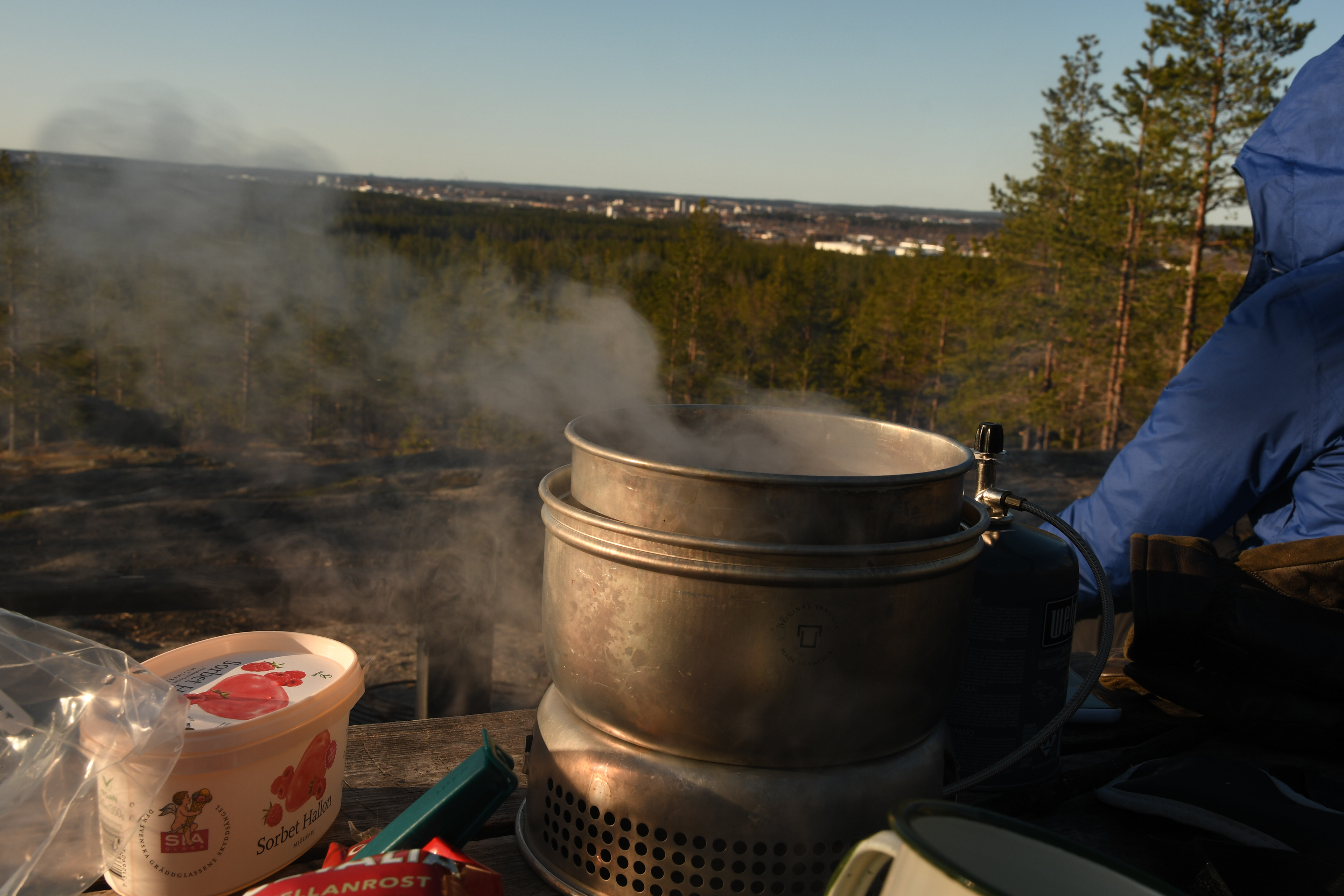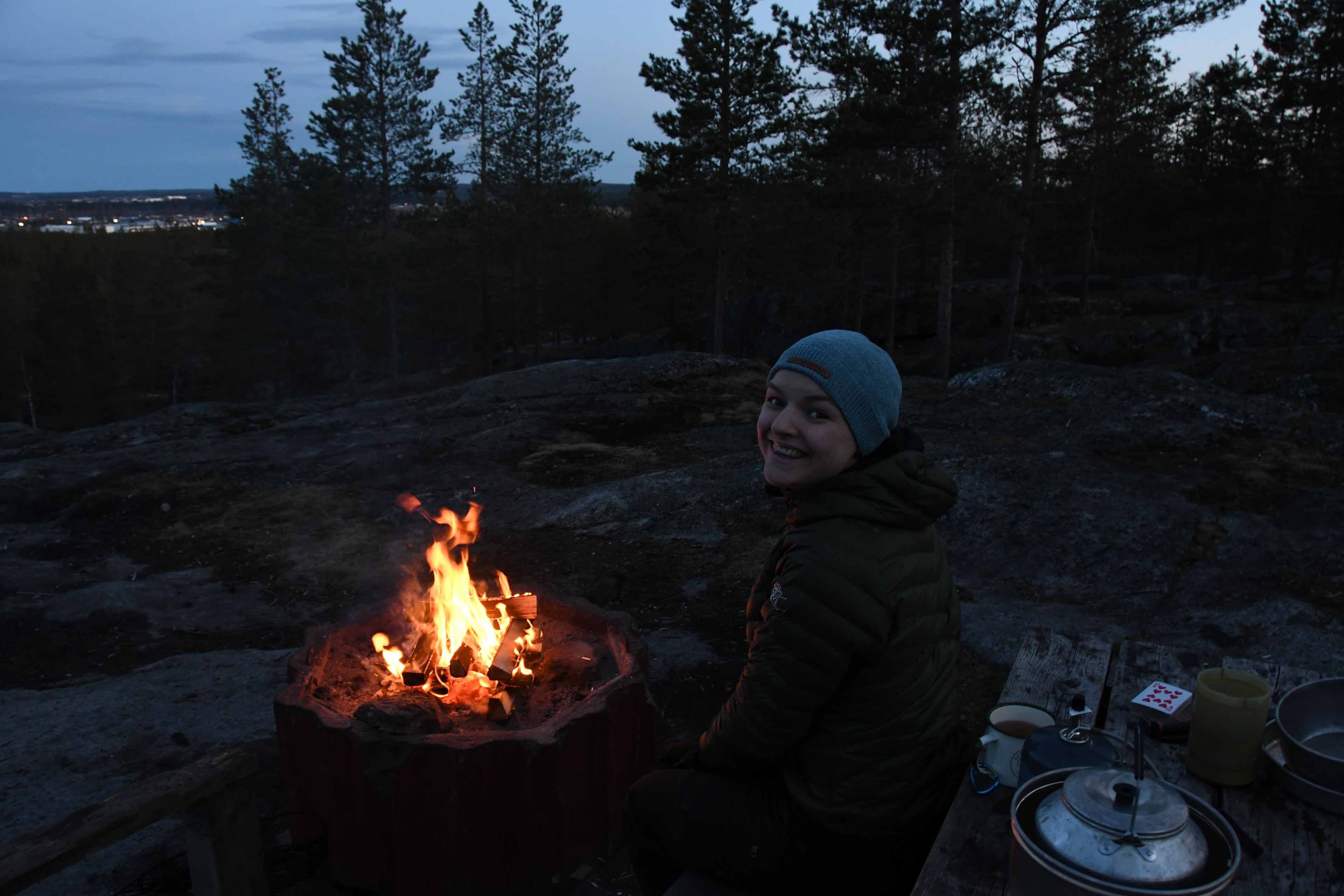 När vi kom fram så gjorde vi upp en eld och spelade lite vändtian och bäddade för natten. Natten var väldigt kall, det blev minus fyra grader och det märktes både av mig som blev täppt i näsan och Mikaela som fick lyssna på snarkande som följde det tidigare nämnda problemet. Jag hade bytt tröja när vi kom fram till stugan på grund av att den jag bar då var fuktig av svett och detta ledde till nedkylning. Jag hände upp den blöta tröjan på tork men när jag vaknade så var den stelfrusen. På grund av den både tidiga, ljusa och kalla morgonen så fick verken jag eller Mikaela någon vidare bra sömn. Det gjorde oss inte så mycket vi var bara glada att få vara ute. Vi vaknade vid fem på morgonen efter bara fem timmar av dålig sömn men utsikten kompenserade stort. Vi kokade upp kaffe och te samt kokade ägg. Vi satt vid brasan och år ägg med aromat i vår stillhet, ensamma och njöt av den kyliga men vackra majmorgonen. Även fast vi njöt så var det kallt så efter en timme av frukostnjutning så packade vi ihop och begav oss tillbaka. Vi ringde en taxi när vi nått samma punkt som vi startade vid och den kom inom tio minuter. Vi kom hem klockan sju på morgonen och jag och Mikaela somnade direkt och vaknade klockan två på förmiddagen. Detta summerar vår första natt ute för i år!