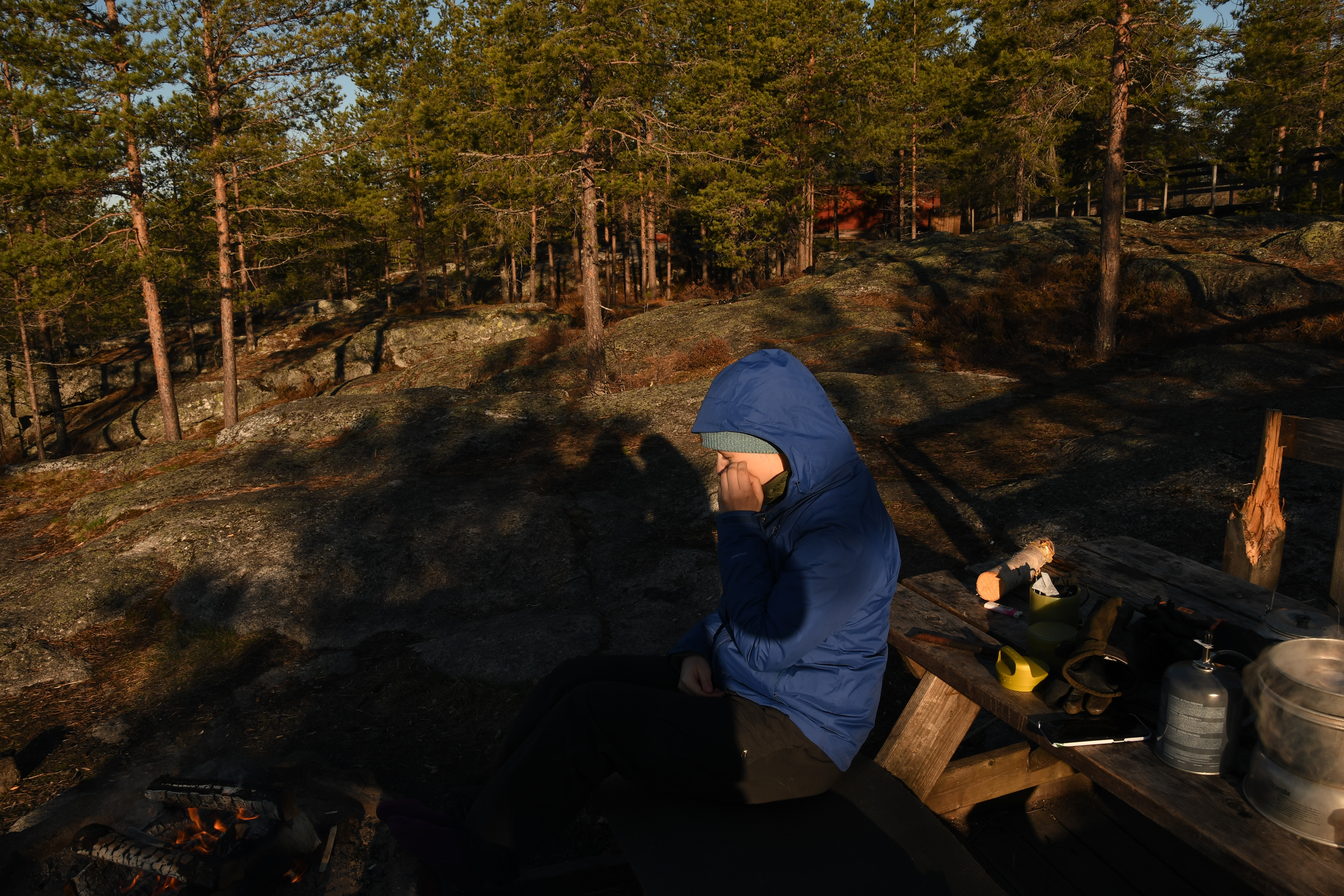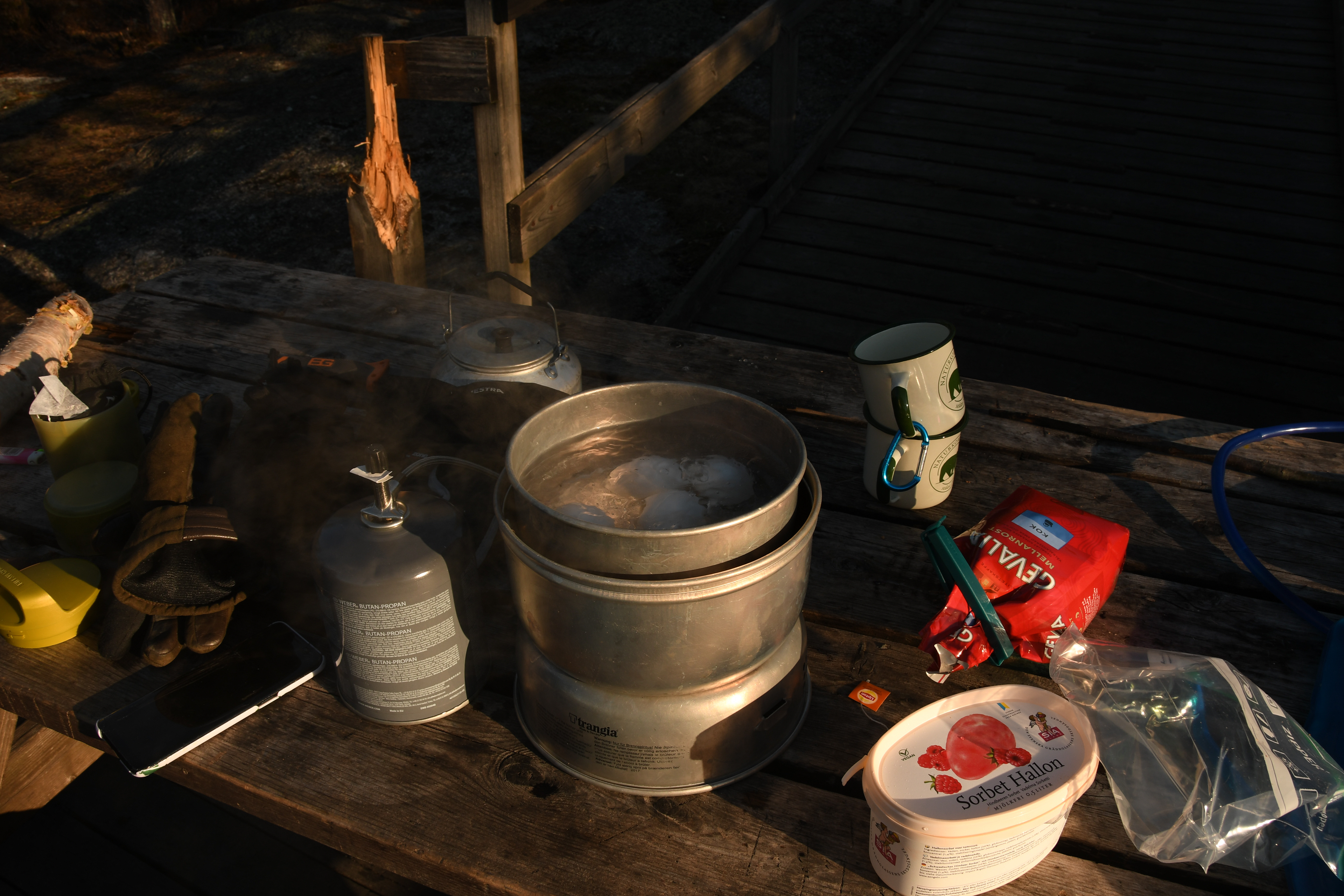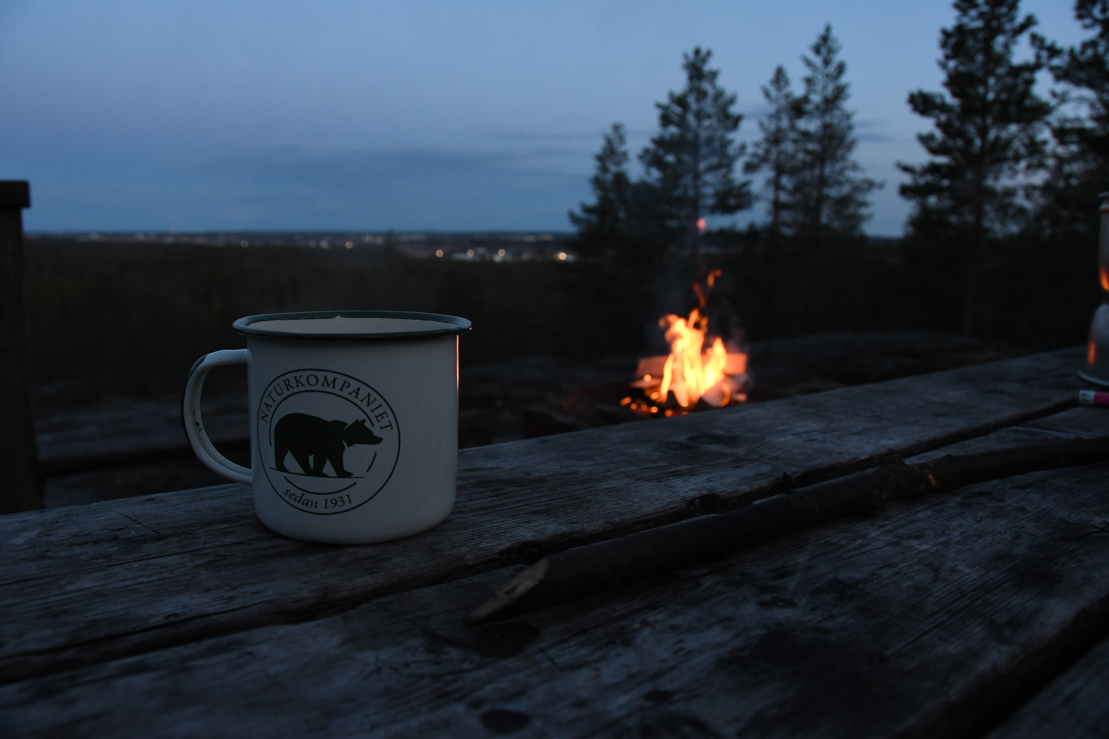 När vi kom fram så gjorde vi upp en eld och spelade lite vändtian och bäddade för natten. Natten var väldigt kall, det blev minus fyra grader och det märktes både av mig som blev täppt i näsan och Mikaela som fick lyssna på snarkande som följde det tidigare nämnda problemet. Jag hade bytt tröja när vi kom fram till stugan på grund av att den jag bar då var fuktig av svett och detta ledde till nedkylning. Jag hände upp den blöta tröjan på tork men när jag vaknade så var den stelfrusen. På grund av den både tidiga, ljusa och kalla morgonen så fick verken jag eller Mikaela någon vidare bra sömn. Det gjorde oss inte så mycket vi var bara glada att få vara ute. Vi vaknade vid fem på morgonen efter bara fem timmar av dålig sömn men utsikten kompenserade stort. Vi kokade upp kaffe och te samt kokade ägg. Vi satt vid brasan och år ägg med aromat i vår stillhet, ensamma och njöt av den kyliga men vackra majmorgonen. Även fast vi njöt så var det kallt så efter en timme av frukostnjutning så packade vi ihop och begav oss tillbaka. Vi ringde en taxi när vi nått samma punkt som vi startade vid och den kom inom tio minuter. Vi kom hem klockan sju på morgonen och jag och Mikaela somnade direkt och vaknade klockan två på förmiddagen. Detta summerar vår första natt ute för i år!