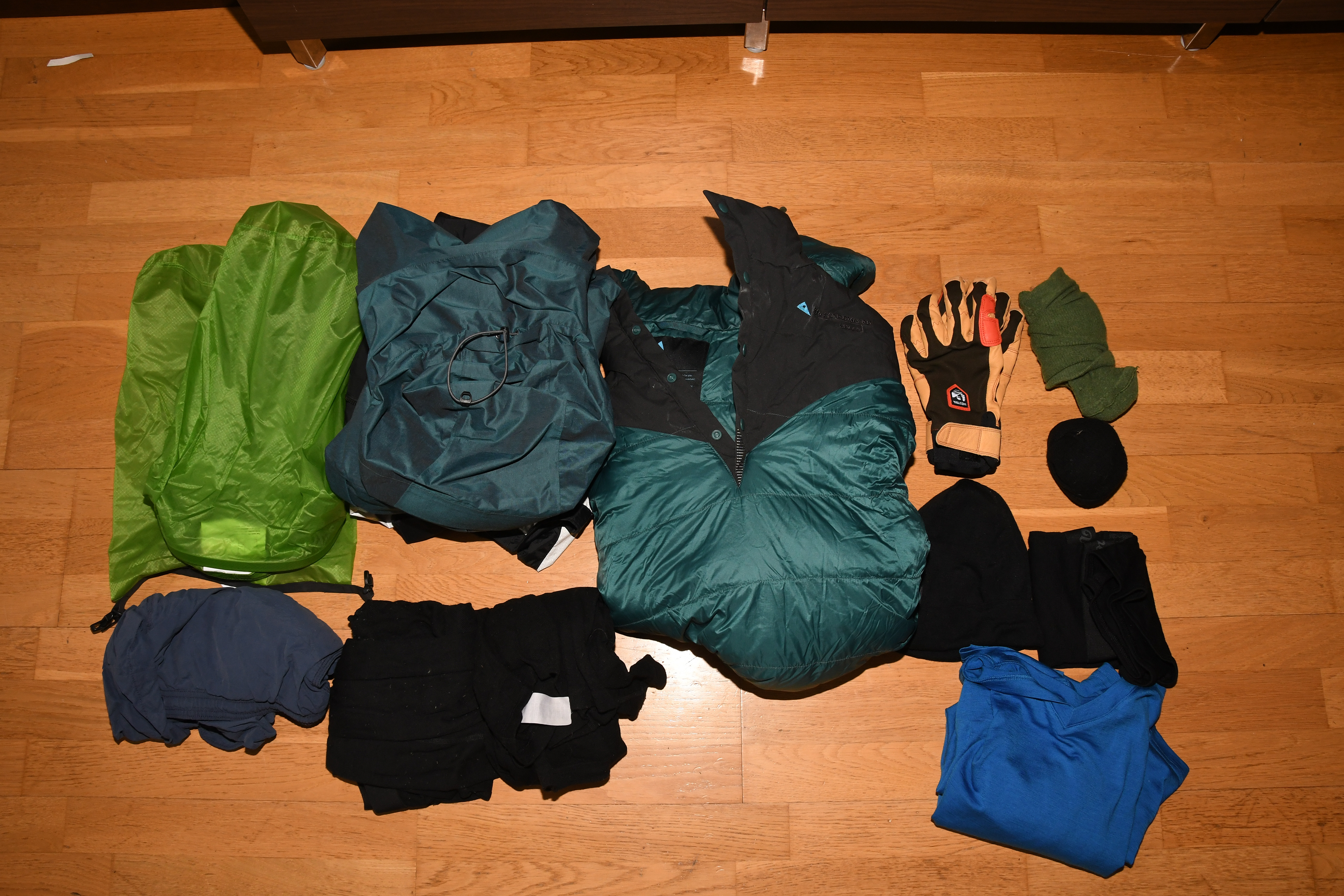 Detta är de kläder som jag kommer ha nerpackade i min väska (alltså exklusive de kläder jag har på mig). Från vänstra övre hörnet har vi; Två vattentäta packpåsar att packa kläderna i. Sedan har vi regnbyxor och regnkläder, dunjacka att ha på sig när vi pausar, Den ska dock ogärna användas när man vandrar då fukten från svetten tar bort en stor del av jackans värmande egenskaper. Sedan har vi ett par handskar i getskinn och under den en yllemössa. Till höger om handskarna har vi ett par gröna strumpor som är reservstrumpor för vandring och under dom har vi ett par svarta att sova i och under dom har vi ett par extra underkläder. Från undre vänstra hörnet har vi badbyxor, underställ och till sist har vi en extra tröja i ull att vandra i.