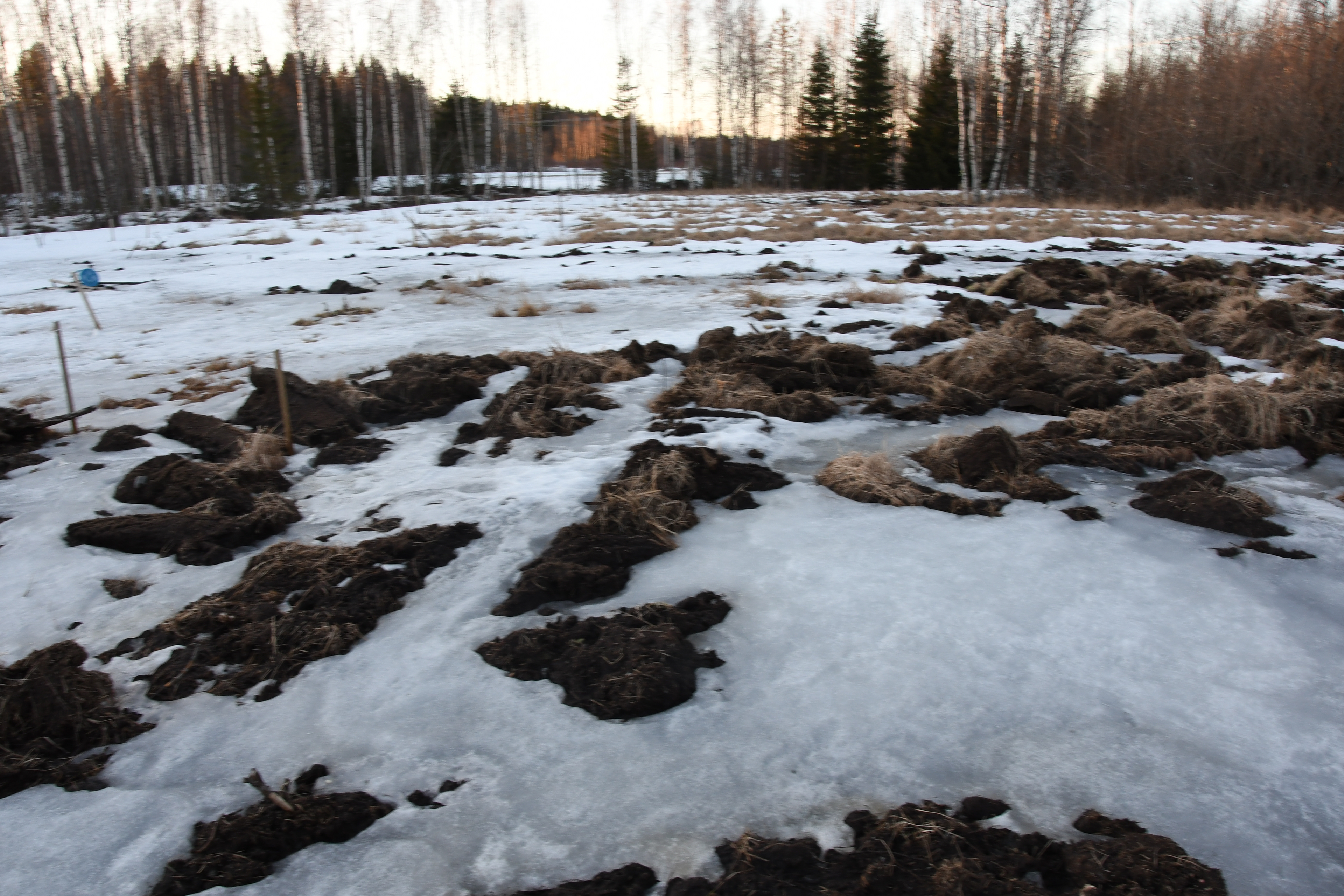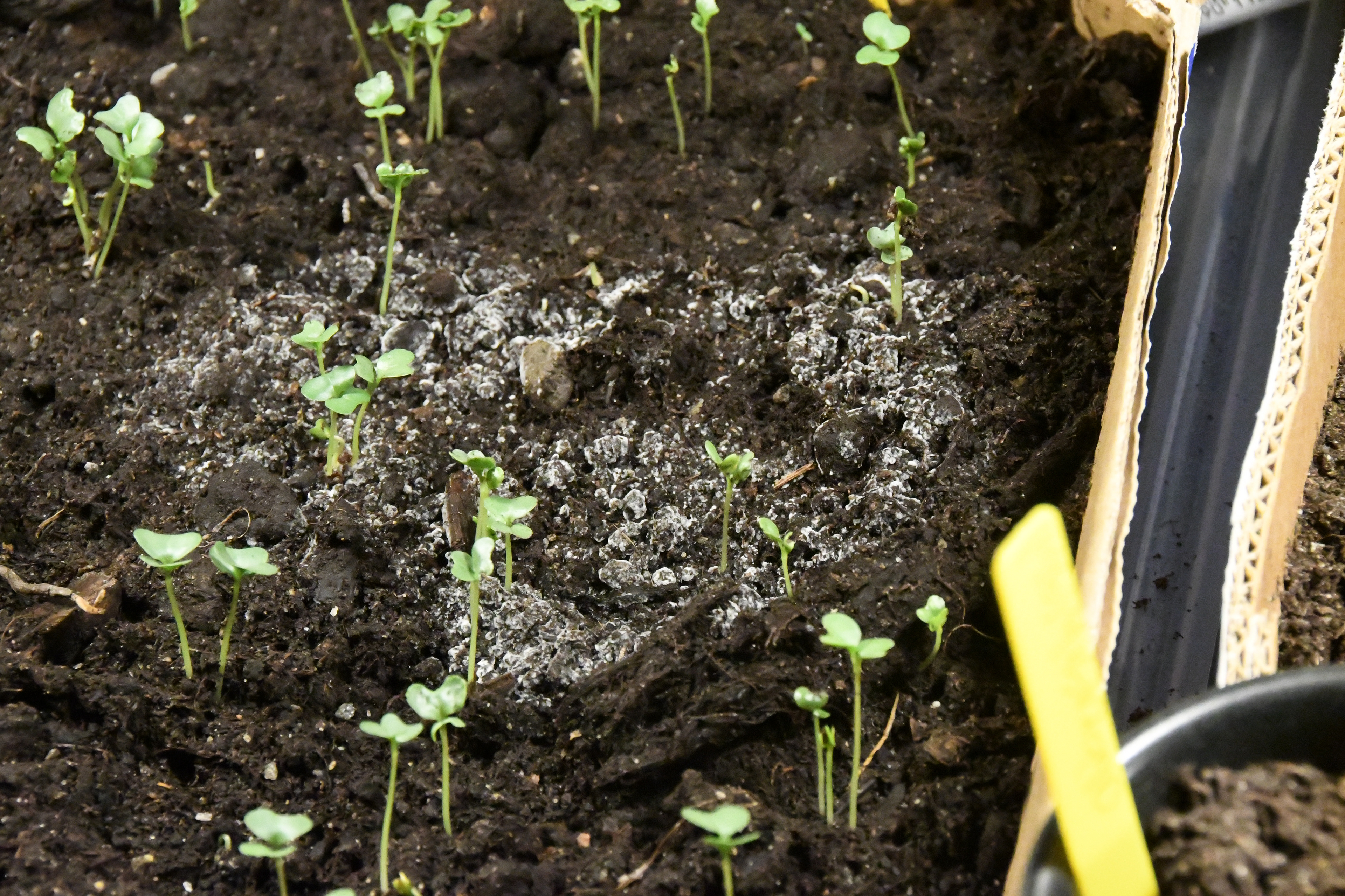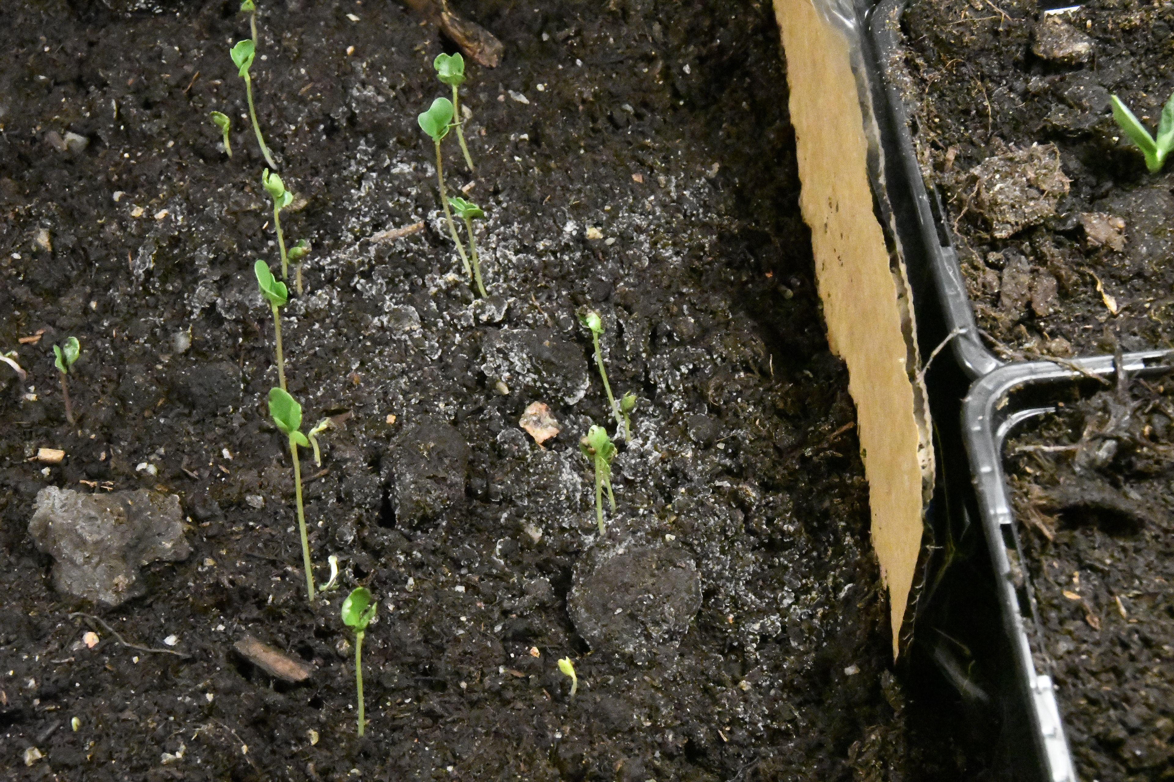 Nu har möglet börjat att dö ut,  det kan man se när man klämmer ihop lite av det och det börjar damma. Vi vattnade inte på två dagar så att jorden börjar torka ut och därmed dödar svampen (mögel är en typ av svamp).  Det hjälpte mycket att vi odlar i kartonger vilket är ett bra material för att absorbera vattnet.