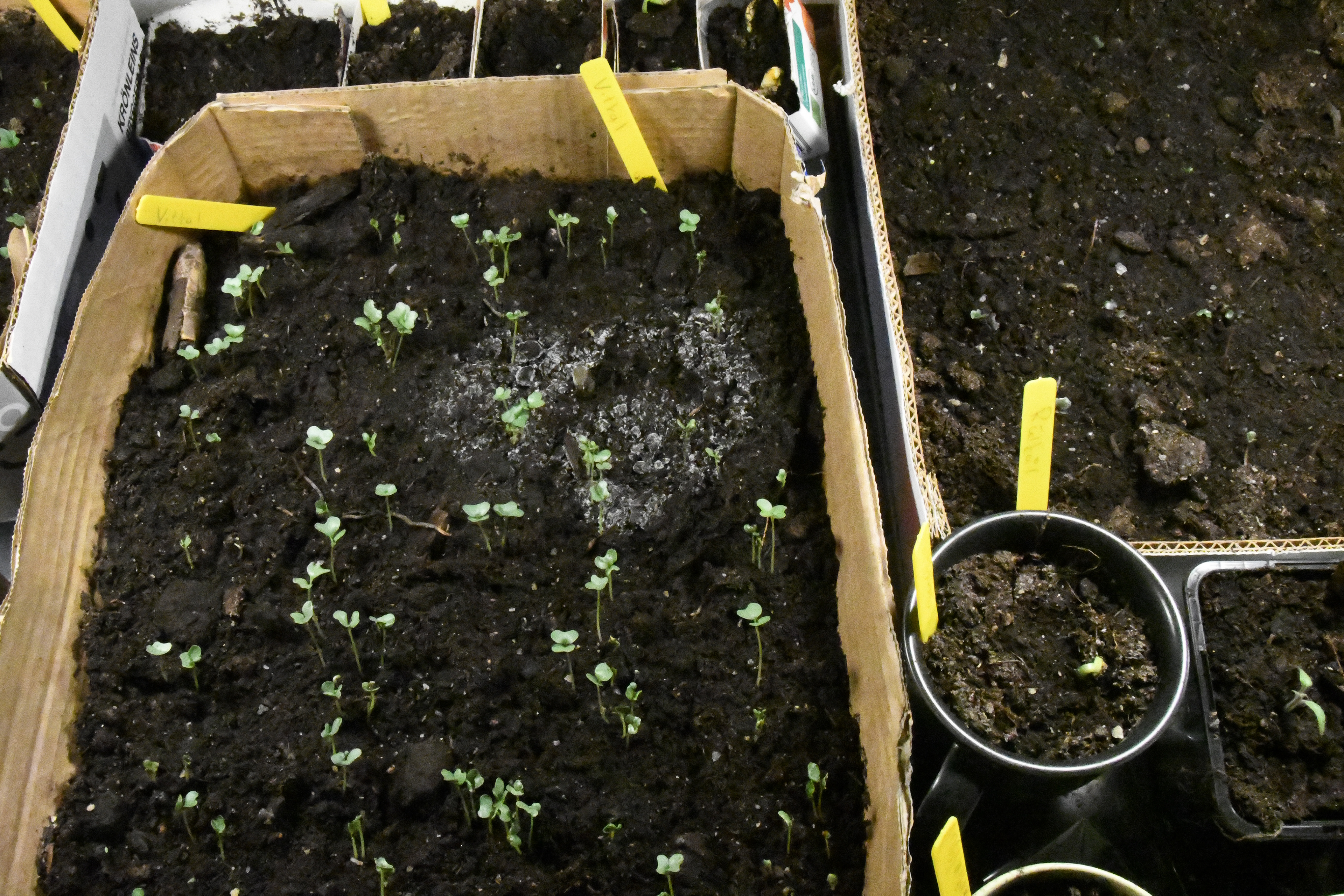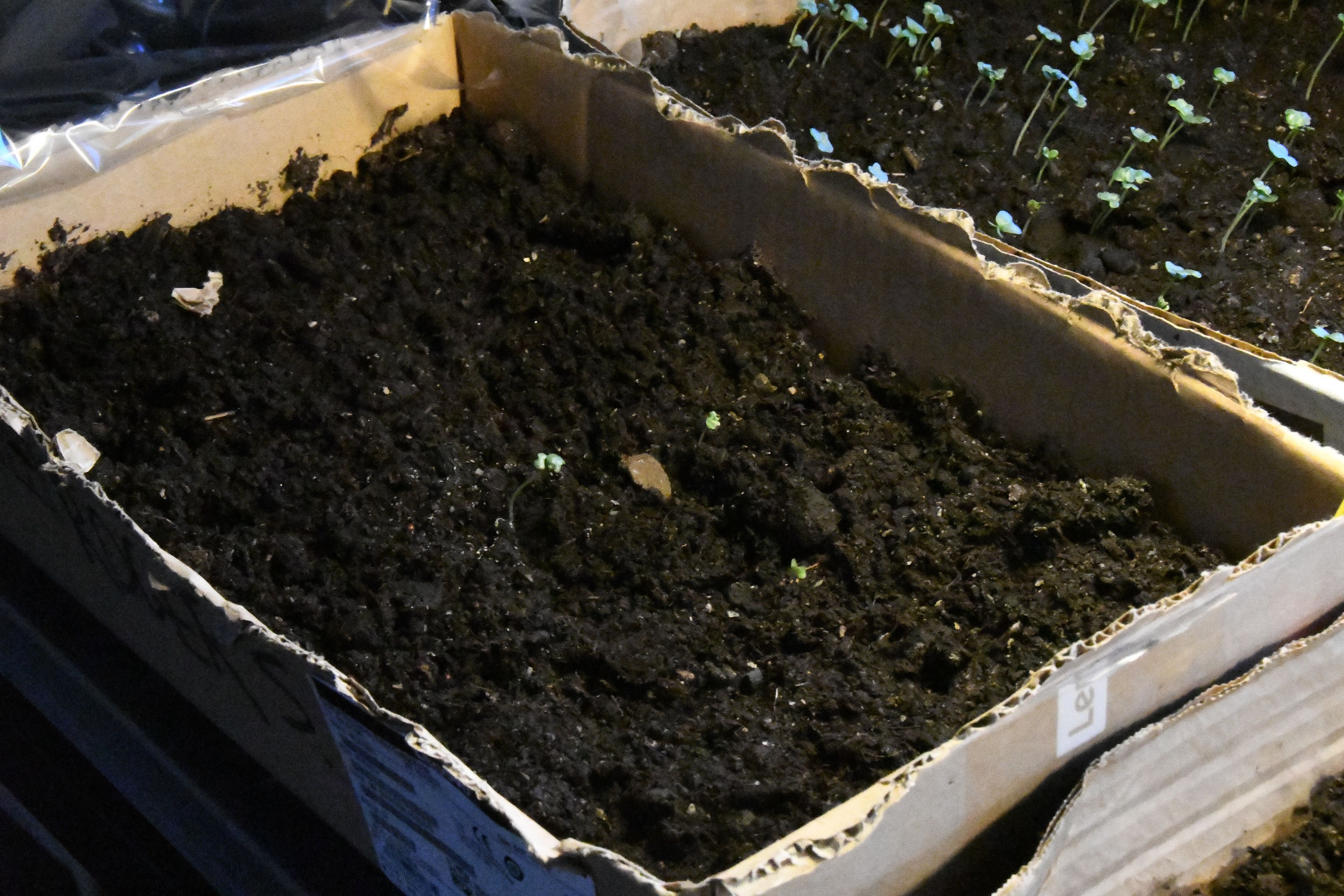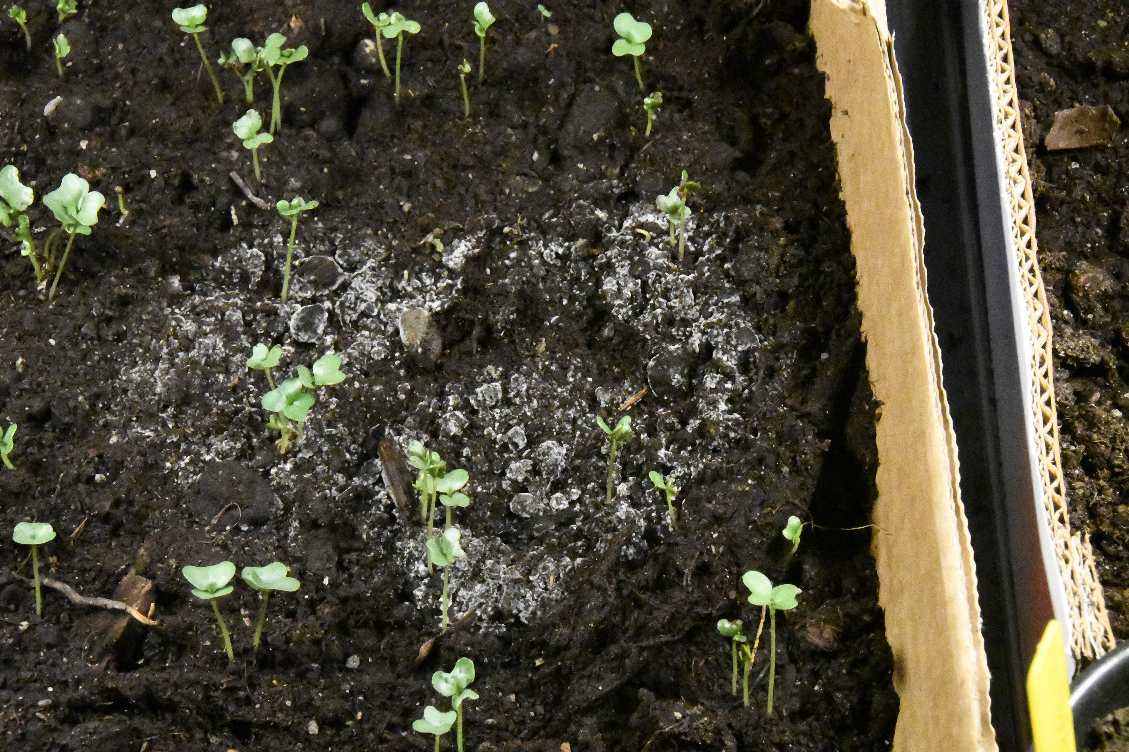 Vi har nu hittat anledningen till att det är nästan ingen tillväxt hos kålrabbin och långsam tillväxt i rödkålen. Vi förstod det när det började växa mögel på jorden. Ett tecken på övervattning är när det börjar väga vitt mögel ovanpå jorden. Vi har odlat alla grödor i kartonger, tre stycken i gamla ölkartonger och två i lite grövre kartonger. Det är i dessa grövre kartonger som det har skett minst tillväxt. Vi tror att anledningen till detta är på grund av att de två kartongerna har grövre lineing (skiktet som ligger mot jorden) vilket har lätt till sämre avrinning. Nedan kan ni se bilder från två olika dagar där möglet gror. Om ni ser detta i era odlingar så kan man blanda ner lite torr sand eller dylikt som kan hjälpa till att absorbera fukten lite.